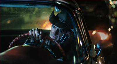 Otto finally locates the car his company has been after, a radioactive Chevrolet Malibu that emits an ethereal green glow. He enters it cautiously, and his astonished countenance is framed tightly in the composition. The Malibu magically rises into the sky, darts around Los Angeles, and it also disappears, somewhere into the starry cosmos.