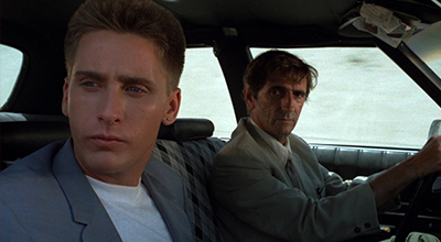 Otto goes through a similar transformation in Repo Man. He’s a Los Angeles teen raised by consumerist parents and stuck in a place that cultivates more idle angst than opportunity. He’s dumped by his girlfriend and quits his job at a supermarket, and when a suspicious individual offers him money to drive a car Otto complies, if only because he has nothing else to do. He’s soon indoctrinated into the seedy underworld of vehicular repossession, populated by men dressed in suits stained in coffee or cigarette ash or sweat, and who are so casually antagonistic that the legality of their enterprise is questionable. When Otto shows up he’s instantly out of place: he’s many years his colleagues’ junior and befitted with some remnants of optimism, while they all look like pigeons competing for the same scraps of bread. Soon, Otto’s outfitted in his own suit, surveilling outer Los Angeles in the passenger seat next to his boss, Bud.