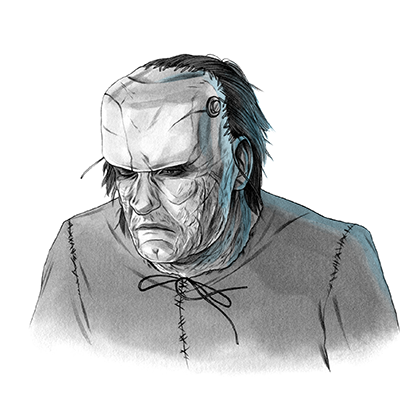 Simon is star struck and quickly sees through Frankenstein’s ruse (he’s donned the alias Dr. Carl Victor): he’s been sentenced here as punishment for his experiments, and has blackmailed the warden in order to continue practicing in secret on the institution’s woeful patients. He tours Simon around the premises and introduces its star inmates: a violinist who has elegant hands; another is a genius; and one is heralded for his physical strength, but he is conspicuously absent from his cell (the thick iron bars on its window have been pried open). Simon learns that all three will be combined in Frankenstein’s newest creation, the prototype of which is kept in a cage and resembles nothing of his human precursors. It’s as though Frankenstein has repeatedly renovated the same body over and over with better parts.