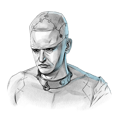 The design had some resemblance to the original American Frankenstein with Boris Karloff, but was different in several ways. I had the idea of the cranium being opened across the top of the forehead and rather clumsily sewn together with large thongs, to suggest the crude surgical procedures of the time. I think I put the electrodes on the temple whereas, in the Karloff one, they put them on the neck. I had [the actor] wear divers’ boots which I thought would suggest a great lumbering creature.23
